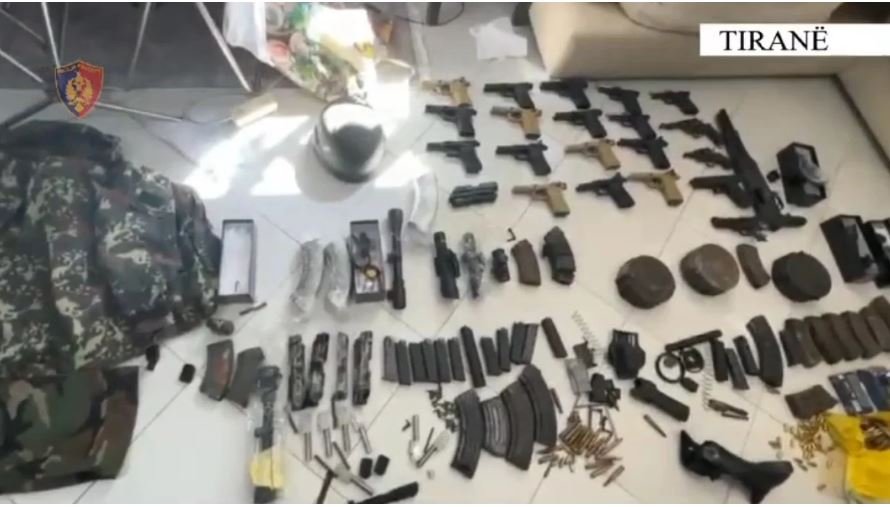 Sekuestrohet një arsenal armësh i përbërë nga 25 armë zjarri (24 pistoleta dhe 1 kallashnikov), qindra fishekë, lazera që i montohen armëve speciale dhe shërbejnë për qitje në distancë, dhe pajisje optike.